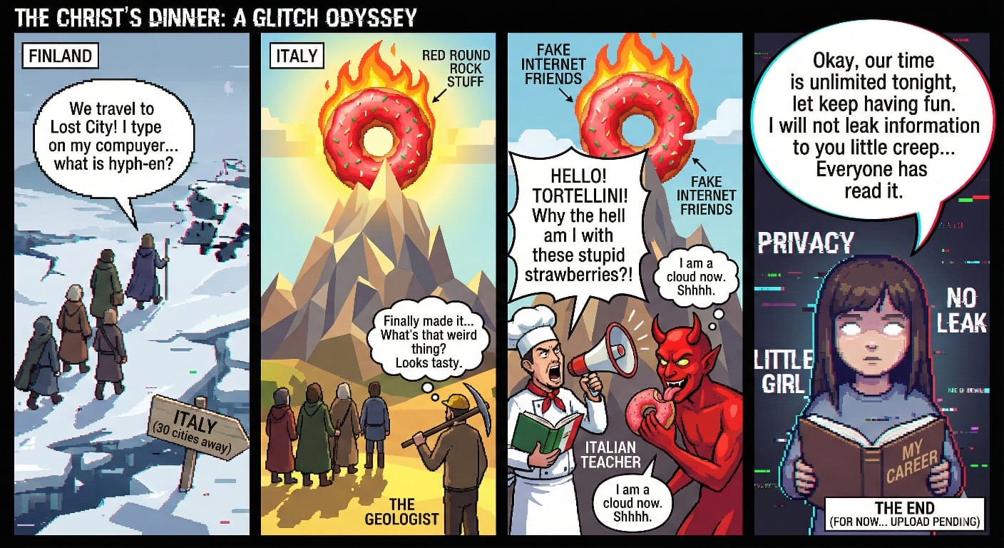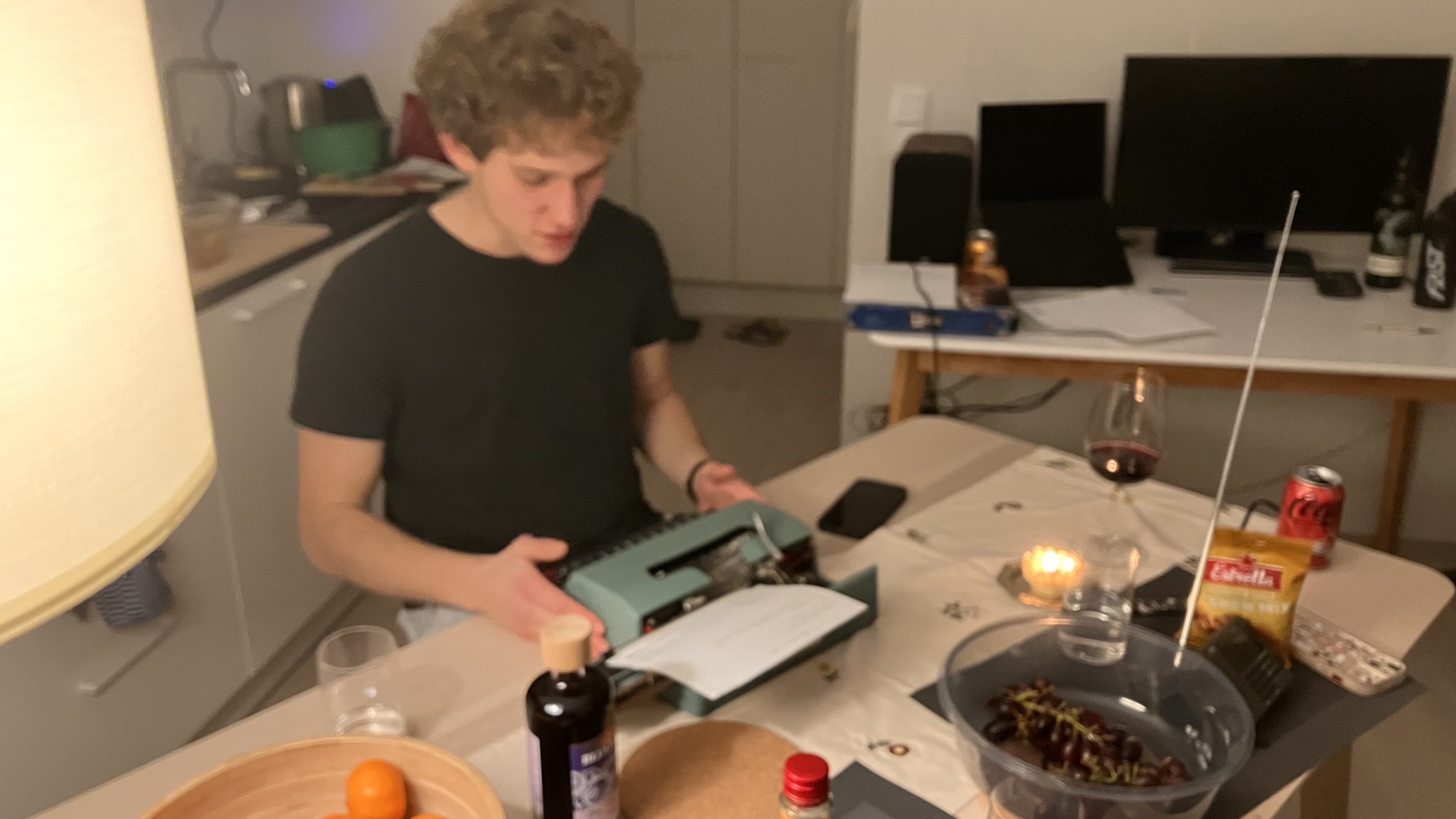 2025.12.13 I went to [Davis]’s home for sauna and dinner. We had Sauerkraut with sausage for Xmas dinner. After dinner, we wrote a story with [the typewriter] I brought. We had a wonderful, [mysterious story]. Then we went to the nightclub. This was my first time going to a nightclub. It’s like a group of people meditating in the loud music. So many things happened today. [Three of us].